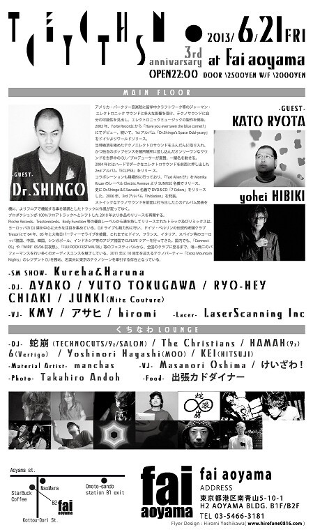 過去にはDJ TASAKA,Q'HEY,DR.SHINGO,REE.K,TAKAMI,HIDEO KOBAYASHIなど国内のTECHNO TOP DJ陣を召喚してきた。