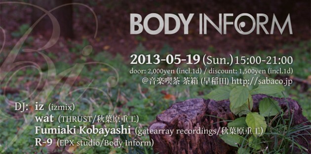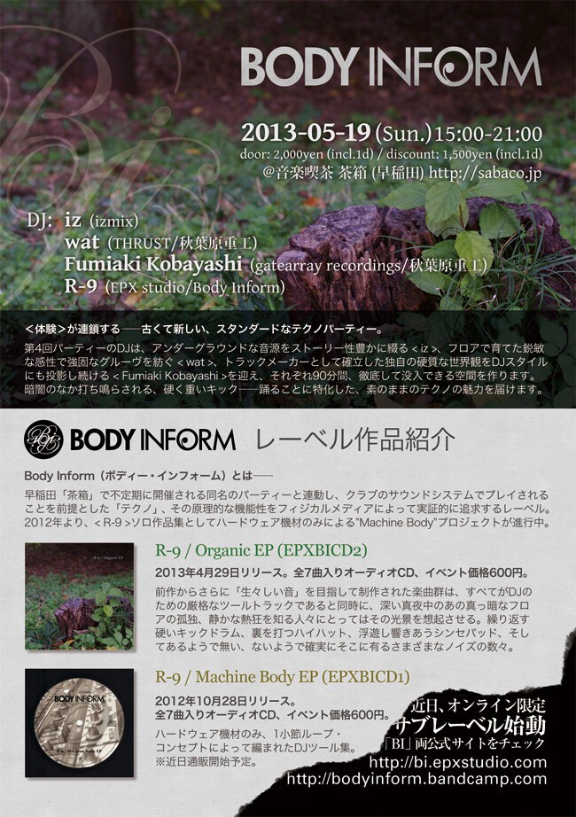 第4回パーティーのDJは、アンダーグラウンドな音源をストーリー性豊かに綴る[ iz ]、フロアで育てた鋭敏な感性で強固なグルーヴを紡ぐ[ wat ]、トラックメーカーとして確立した独自の硬質な世界観をDJスタイルにも投影し続ける[ Fumiaki Kobayashi ]を迎え、それぞれ90分間、徹底して没入できる空間を作ります。