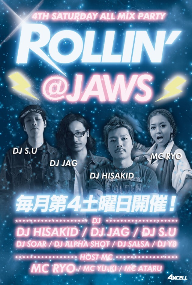 AXCELLがお届けする今話題の人気CLUB JAWSの第四土曜日はR&B HIP HOP REGGAEやTOP40にELECTROまで様々なジャンルを楽しめるALL MIX PARTY"ROLLIN"(ローリン)