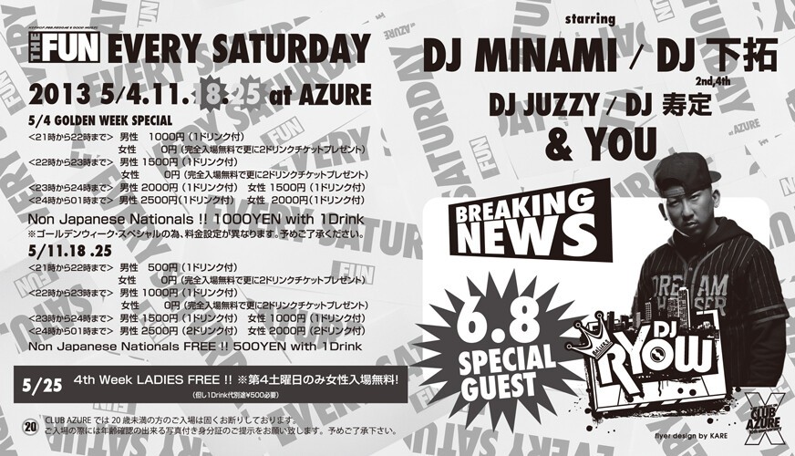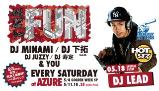 知らない人は無し、大阪いち有名なこの場所この曜日この時間。SOUL FOOD、SATURDAY AZUREに続く、毎週土曜日の新定番パーティー『THE FUN』が、2011年10月より始動!DJ MINAMI & DJ 下拓の、揺るぎないツートップは勿論、アーリータイムから、HipHopを中心にR&BやReggae、また近年のチャートを賑わすダンスチューンなど幅広い選曲が楽しめます!関西クラブ遊びの登竜門とも言える『土曜日のアズール』には、本当に色んな人が遊びに来ており、毎週来ても新たな音楽・お酒・友達と出会える、チェック必至のパーティーです!出会いの秘訣は、何より“楽しむ”こと!週末土曜日の夜を素敵なものにしたいパーリーピーポー達よ!JUST HAVE FUN!!