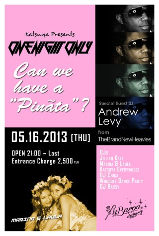 DJ陣にはスペシャルゲストとしてGREENROOM FESTIVALのために来日する、the Brand New HeaviesよりBass PlayerのAndrew Levy。UKジャマイカンテイストな音楽や、新人DJグループMarina&Laulaによるブラジリアンテイストな音楽などさまざまな雰囲気が楽しめます。一夜限りのOne Night Only、お見逃しなく!