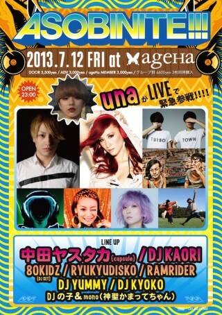 毎回、期待を裏切らないバラエティ豊かなラインナップを実現するASOBINITE!!!今回のARENAは中田ヤスタカ(capsule)、DJ KAORI,80KIDZ(DJ SET)、RYUKYUDISKO、RAM RIDERを筆頭に、さらにLIVEとしてUnaの出演が急遽決定!!! WATERではDJ YUMMY、 DJ KYOKO、DON’T BELIEVE THE TV(2BOY+KOHNO)といった夏らしいメンツが揃い、さらにBOXはDJ の子&mono(神聖かまってちゃん)、DJ 急行&セーラーチェンソー、西村ひよこちゃん(TRUMP ROOM)、さっちょ(佐藤さき)といった異色のメンバーが集結。そしてISLANDはASOBI若手DJが集結!! ウィークデイパーティの常軌を逸した豪華布陣でお届けするビッグパーティ『ASOBINITE!!!』に是非お越し下さい!
