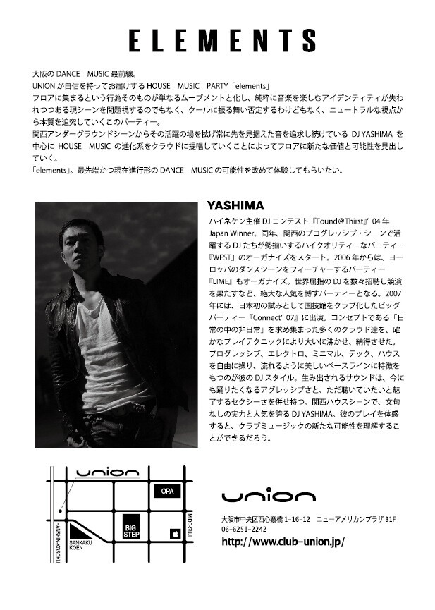 関西アンダーグラウンドシーンからその活躍の場を拡げ常に先を見据えた音を追求し続けているDJ YASHIMAを中心にHOUSE MUSICの進化系をクラウドに提唱していくことによってフロアに新たな価値と可能性を見出していく。