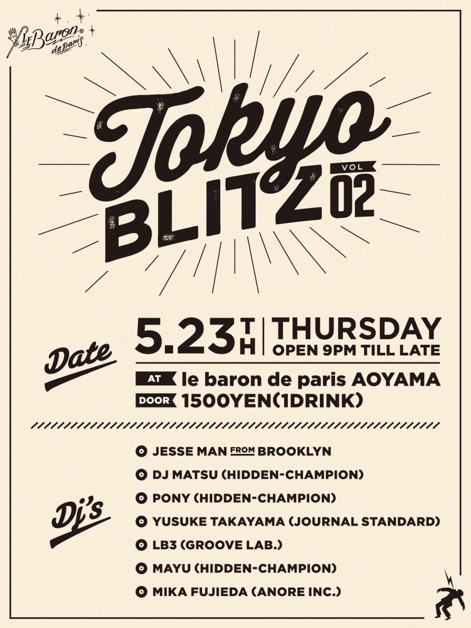 今夜、若手DJ陣がLe Baron de Parisで東京のナイトシーンにブリッツを仕掛ける!世の中がバブルで盛り上がっていた時代を、何のおこぼれも受けずに砂場で過ごしていた30代の若手DJ陣が、東京のナイトシーンの覚醒を企んで集結する。ファッション、音楽、デザイン、アートの分野で活躍する彼らのテイストを存分にお楽しみあれ!