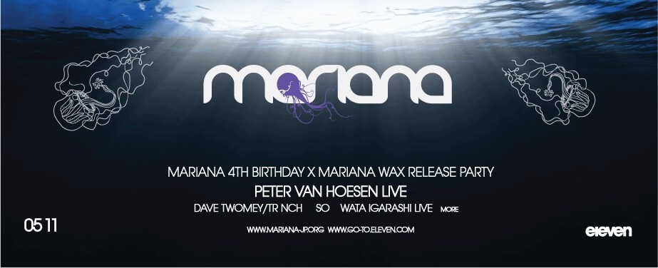 Mariana was 4 years old in March and with this blessed landmark comes the birth another new child, the MARIANA WAX record label, due for its first release in May to co-incide with our first event our new home ELEVEN in Tokyo with tracks by Tr nch, Mike Parker & Wata Igarashi. We will be celebrating both in equal measure on May 11th presenting Mariana friend & all-round techno superhero PETER VAN HOESEN and his brand new live show at Eleven, our new home. More drum machines, synths, ipads, effectors and more are promised & rinsed to hell through the heavy Eleven system this is going to be something really special, we have no doubt. Mariana founder under DAVE TWOMEY (X TR NCH) will provide strong support on the hallowed Eleven turntables having last spun here as resident for 'Spice!' 9 plus years ago. Labyrinth's So will provide the main warmup, showing us his deep set with Wata Igarashi, another of our residents & opening contributor to Mariana Wax and Raft's Tez providing support. The lounge will be co-ordinated by So & feature a whole bunch of fan-tastic djs.