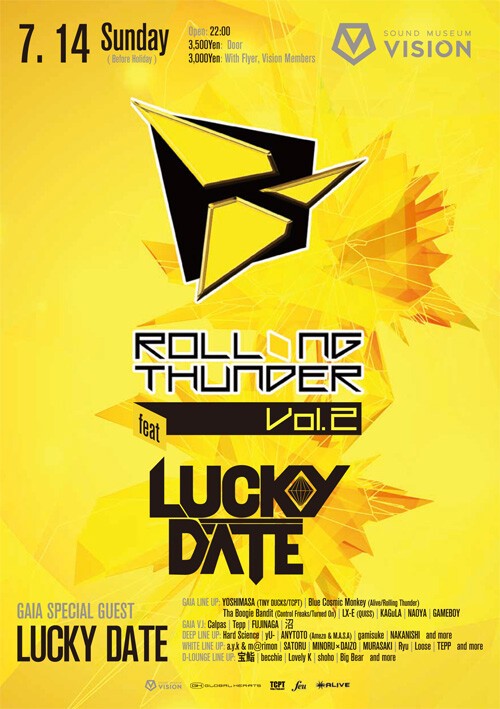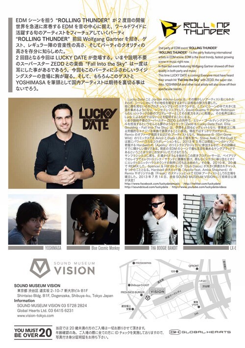 “ROLLING THUNDER”! is the party featuring international artists in EDM scene. EDM is the most trendy, fastest growing scene in music right now. In their last event featuring Wolfgang Gartner showed off their quality in both party and music. This time LUCKY DATE is coming! Everyone must have heard their smash hit “Fall Into the Sky” with ZEDD, the super star. Also, YOSHIMASA and other local artists will also show off their spectacular talents.