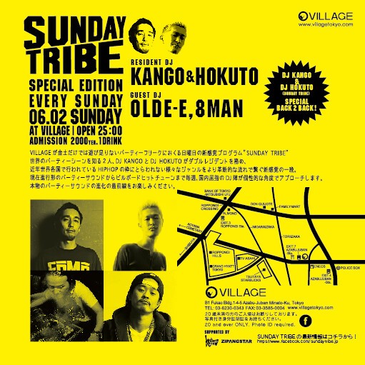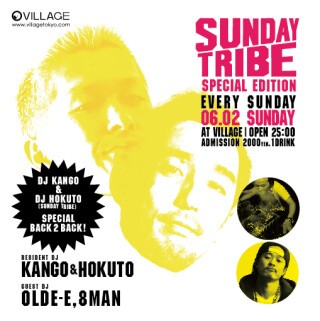 VILLAGEが金土だけでは遊び足りないパーティフリークにおくる日曜日の新感覚プログラム”SUNDAY TRIBE”。世界のパーティシーンを知る2人、DJ KANGOとDJ HOKUTOがダブるレジデントを務め、近年世界各国で行われているHIP-HOPの枠にとらわれない様々なジャンルをより革新的な流れで繋ぐ新感覚の一晩。現在進行形のパーティサウンドからビルボードヒットチューンまで、毎週国内屈指のDJ陣が個性的な角度でアプローチします。本物のパーティサウンドの進化の最前線をお楽しみください。