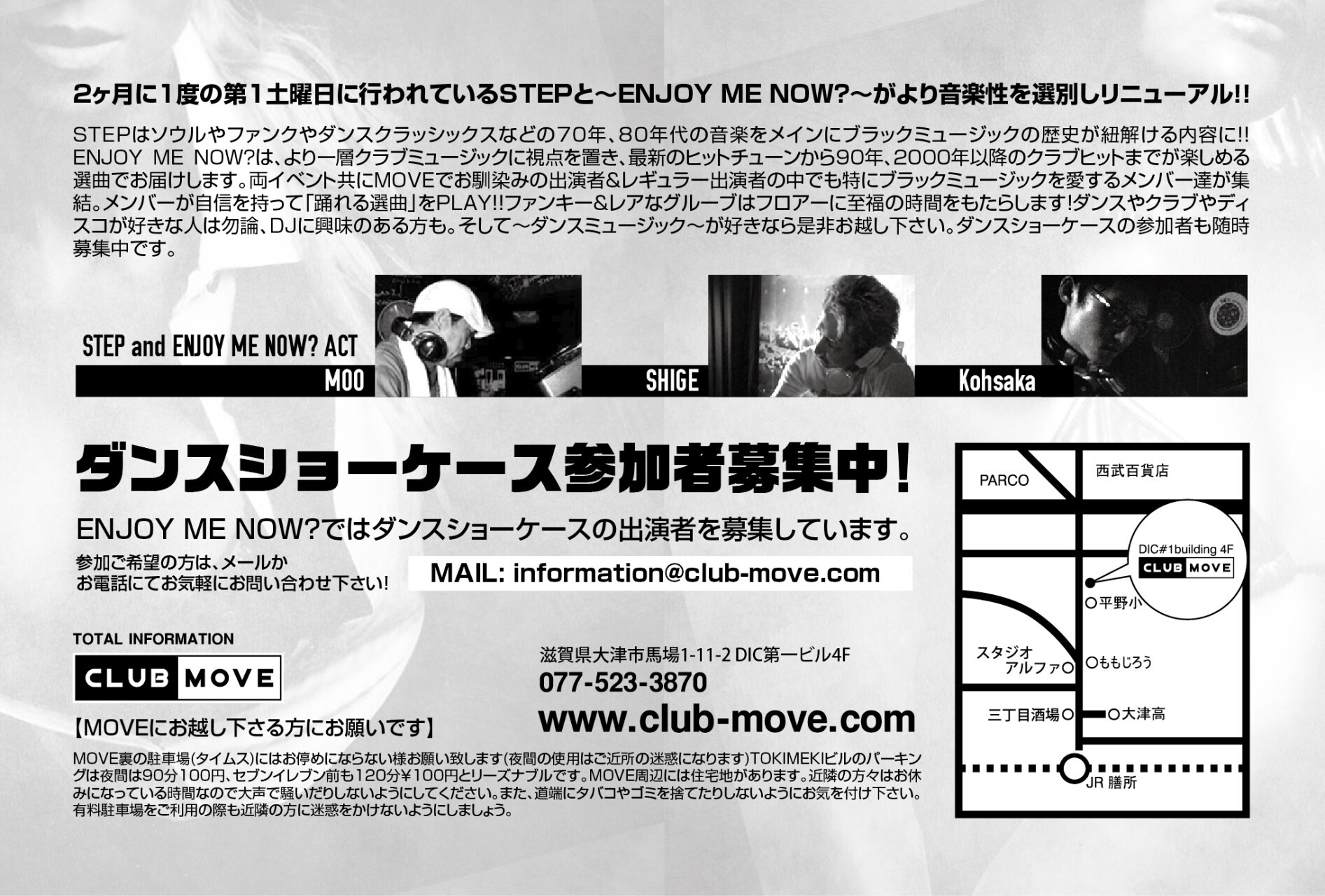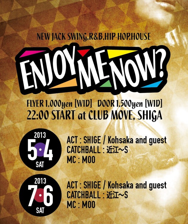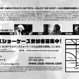 ~ENJOY ME NOW ?~はより一層クラブミュージックに視点を置き、最新のヒットチューンから90年、2000年以降のクラブヒットまでが楽しめる選曲でお届けします。MOVEでお馴染みの出演者 & レギュラー出演者の中でも特にブラックミュージックを愛するメンバー達が集結。メンバーが自信を持って「踊れる選曲」をPLAY!!ファンキー & レアなグルーブはフロアーに至福の時間をもたらします!ダンスやクラブやディスコが好きな人は勿論、DJに興味のある方も。そして~ダンスミュージック~が好きなら是非お越し下さい。ダンスショーケースの参加者も随時募集中です。