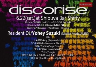 そして時を経て2011年2月にこの枠でスタートした「Amoral」。そして「Accordance」。その流れを引き継ぎさらに進化させ満を持して「DISCORISE」が復活!レジデントにはAmoralからのメインDJとして引っ張ってくれているYohey Suzuki(Nitelist Music/AMEE)を迎え、