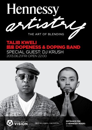 2006年からブランド・プラットフォームとしてグローバルで開始した Hennessy artistry (ヘネシーアーティストリー)。ミキシングの芸術性を強く表現し、音楽、カルチャーやスタイルのコラボレーションにより話題を創出してきた。昨年DJ PREMIER、 HOCUS POCUS を招き開催された熱狂も忘れる事が出来ないが、今回は90年代後半、Mos Def と共に Black Star を結成し、その深いリリックと真摯なラップで各方面から高い評価を受け、今なお躍進を続ける社会派 MC の Talib Kweli が6年振りに登場する。さらにDEEP SPACE初登場の DJ KRUSHや、Hennessy artistry 初出演の鎮座 DOPENESS & Doping Band と、さらなる豪華アーティストが集結する。もはや当日の興奮が約束されていると言っても過言ではない。
