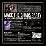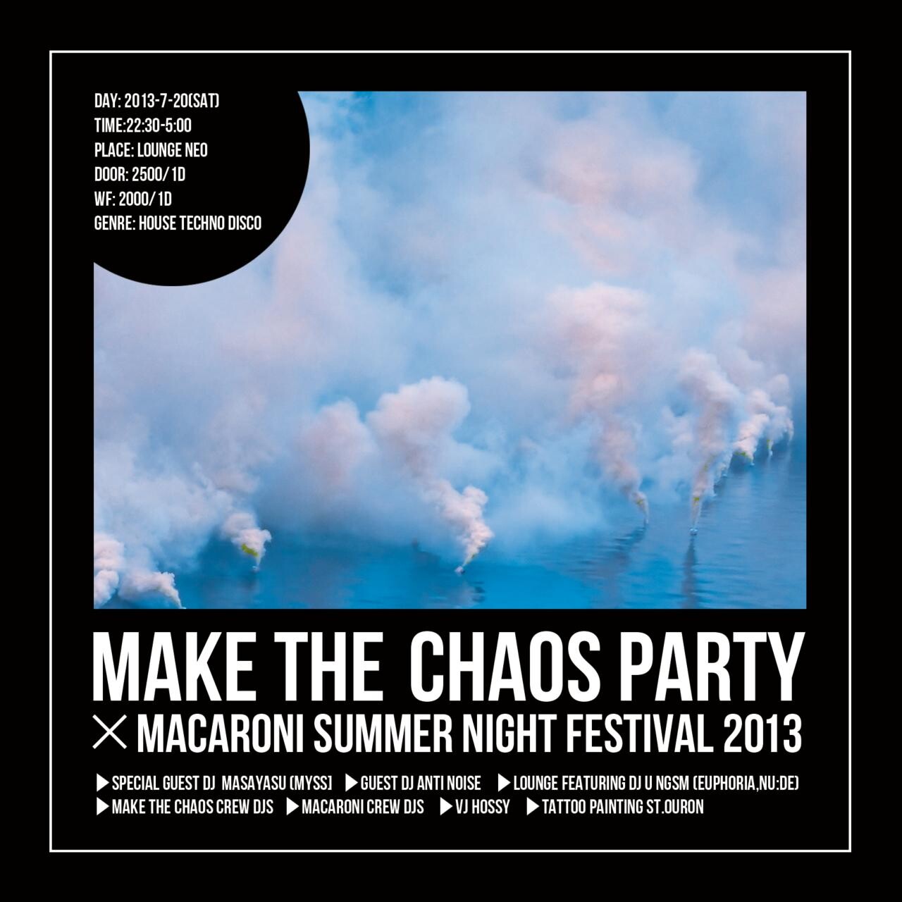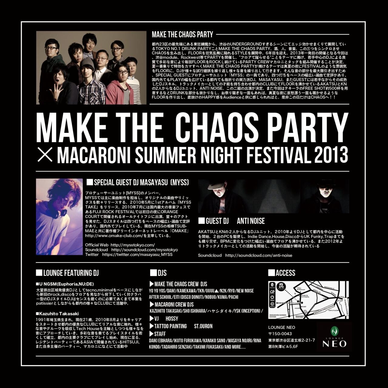 都内23区の最先端にある東狂練魔から、渋谷のUNDERGROUNDすぎるシーンにてエッジ効かせまくりで展開しているTOKYO NO.1 DRUNK PARTYことMAKE THE CHAOS PARTY。酒、人、音楽、この三つをシンクロさせCHAOSを生み出し、FLOORを狂気乱舞に陥れるSTYLEを展開中。6年目を迎え、2013年一発目の開催となる今回は、渋谷module、Rockwest等でPARTYを開催し、"フロアで躍らせる"ことをテーマに掲げ、若手中心のDJによる良質で多彩な音により毎回FLOORをROCKし続けているPARTY CREWマカロニとタッグを組み開催することが決定。夏一番乗りで特効をカマすべくMAKE THE CHAOS PARTYが掲げるテーマは真夏の夜にFESTIVALのような雰囲気をFLOORに。DJが様々な試行錯誤を繰り返し様々な音を繰り出して行きます。そんな音の部分を最大限引き出すため、SPECIAL GUESTにプロデューサユニット「MYSS」の一員であり、四つ打ちをベースの幅広い選曲で定評があり、国内外でもPLAYの幅を広げている都内でも指折りの実力派DJ、MASAYASU。またGUESTには若手ながらその成熟したDJスキル、トラックメイカーとしての才能を持ち合わせ都内のCLUBにてFLOORを沸かせているAKATSUとKNの2人からなるDJユニット、ANTI NOISE。この二組の出演が決定。また今回はテキーラのFREE SHOT約500杯を用意するなどDRUNKな部分も抜かりなし。お祭り騒ぎな一面もあれば、真夏な夜に哀愁漂う一面も覗かせるようなFLOORを作り出し、底抜けのHAPPY感をAudienceと供に感じられればと。是非この日だけはCHAOSへ!!