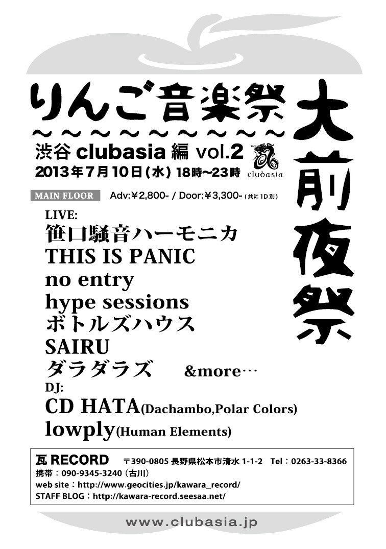 渋谷club asiaにて「りんご音楽祭」の大前夜祭の開催が決定!3フロアをがっつり使い、平日ながらお祭り騒ぎのオールミックスパーティー!このパーティーからも、りんご音楽祭へのブッキングがあるという事もあり、豪華出演者陣も、りんご音楽祭への出演めがけて気合い入っております!
