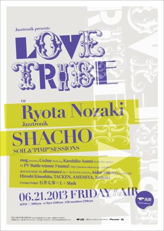 グローバルに活躍するRYOTA NOZAKIのホームグラウンドとして、数多くのオーディエンスから人気を集めてきた“LOVE TRIBE”。これまで国内外の多彩なアーティストたちと刺激的コラボレーションを繰り返し、開催の度に違った魅力を生み出してきたこのパーティに、今回は新たな若手DJたちとともに、SOIL&"PIMP"SESSIONSの社長とJazztronikの野崎良太が、その深く幅広い音楽経験を元に紡ぎ出すエクスクルーシヴな選曲で"LOVE TRIBE"ならではのDJセットを繰り広げる。ラウンジには、都内初の"泡パーティ"や、アメリカネバダ州の砂漠フェスBurning Manの日本版"Burning Japan"などでアイディアを武器に新しい体験をつくりだすイベントチームが登場する。