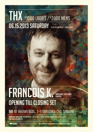 幅広い音楽知識に裏打ちされた見事な選曲と、圧巻のプレイスキル。彼の奏でるロングセットを一度でもフロアで体験したなら、ダンスミュージックの神髄に目覚めるはずだ。François K.は、1970年代後半から現在に至るまでつねにシーンの最先端で活躍を続けてきた驚異的アーティストである。そんな彼のプレイの素晴らしさを1人でも多くのオーディエンスに知ってもらうべく、エントランスフィーを極力低く設定したパーティがこの夜セットされた。タイトルの“thx”は、すべての音楽ファンへの感謝を込めた言葉。François K.の魅力を知り尽くす人はもちろん、彼をあまり知らない新しいパーティピープルにもぜひ参加してほしい。