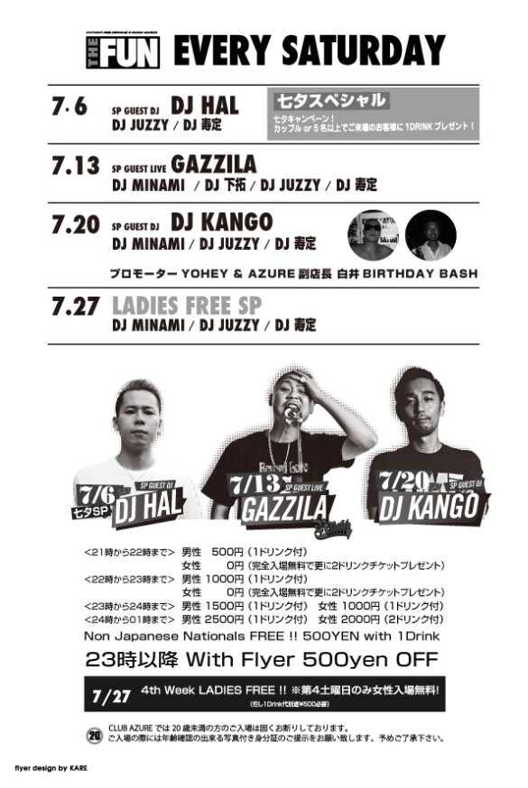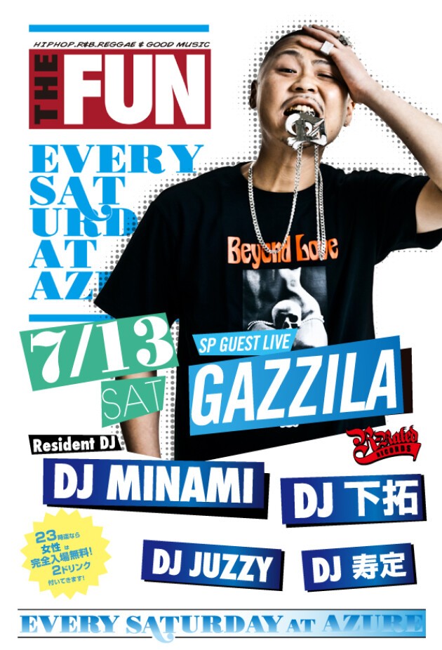 知らない人は無し、大阪いち有名なこの場所この曜日この時間。SOUL FOOD、SATURDAY AZUREに続く、毎週土曜日の新定番パーティー『THE FUN』が、2011年10月より始動!DJ MINAMI & DJ 下拓の、揺るぎないツートップは勿論、アーリータイムから、HipHopを中心にR&BやReggae、また近年のチャートを賑わすダンスチューンなど幅広い選曲が楽しめます!関西クラブ遊びの登竜門とも言える『土曜日のアズール』には、本当に色んな人が遊びに来ており、毎週来ても新たな音楽・お酒・友達と出会える、チェック必至のパーティーです!出会いの秘訣は、何より“楽しむ”こと!週末土曜日の夜を素敵なものにしたいパーリーピーポー達よ!JUST HAVE FUN!!