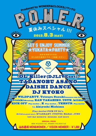 この日、VISIONが最高気温を更新! モンスターイベント『P.O.W.E.R.』が激アツな夏休みスペシャル・パーティを開催!! そのヘッドライナーを務めるのは、これまでに『FUJI ROCK』や『TAICOCLUB camps'11』に出演するなど、ダンスミュージック界を賑わしているOL Killer。カリスマ的人気を誇るスーパースターも参加する3人組DJユニットが、ハウス・クラシックス、最新テクノ、エレクト、さらにはディスコやファンク、歌謡曲までを奔放に操り、とびきりのアグレッシヴなパフォーマンスを披露する。さらに、国際的な俳優として絶大な支持をえるとともに、音楽的な才能も発揮している浅野忠信、日本ハウス界のトップDJ:DAISHI DANCEをはじめ、DJ KYOKOなども出演。また、秋葉原のオタク文化やサブカルチャーを牽引するアーティストも参戦を果たす。浴衣のあの子と音楽を楽しむ、夏の熱帯夜へいざ!!