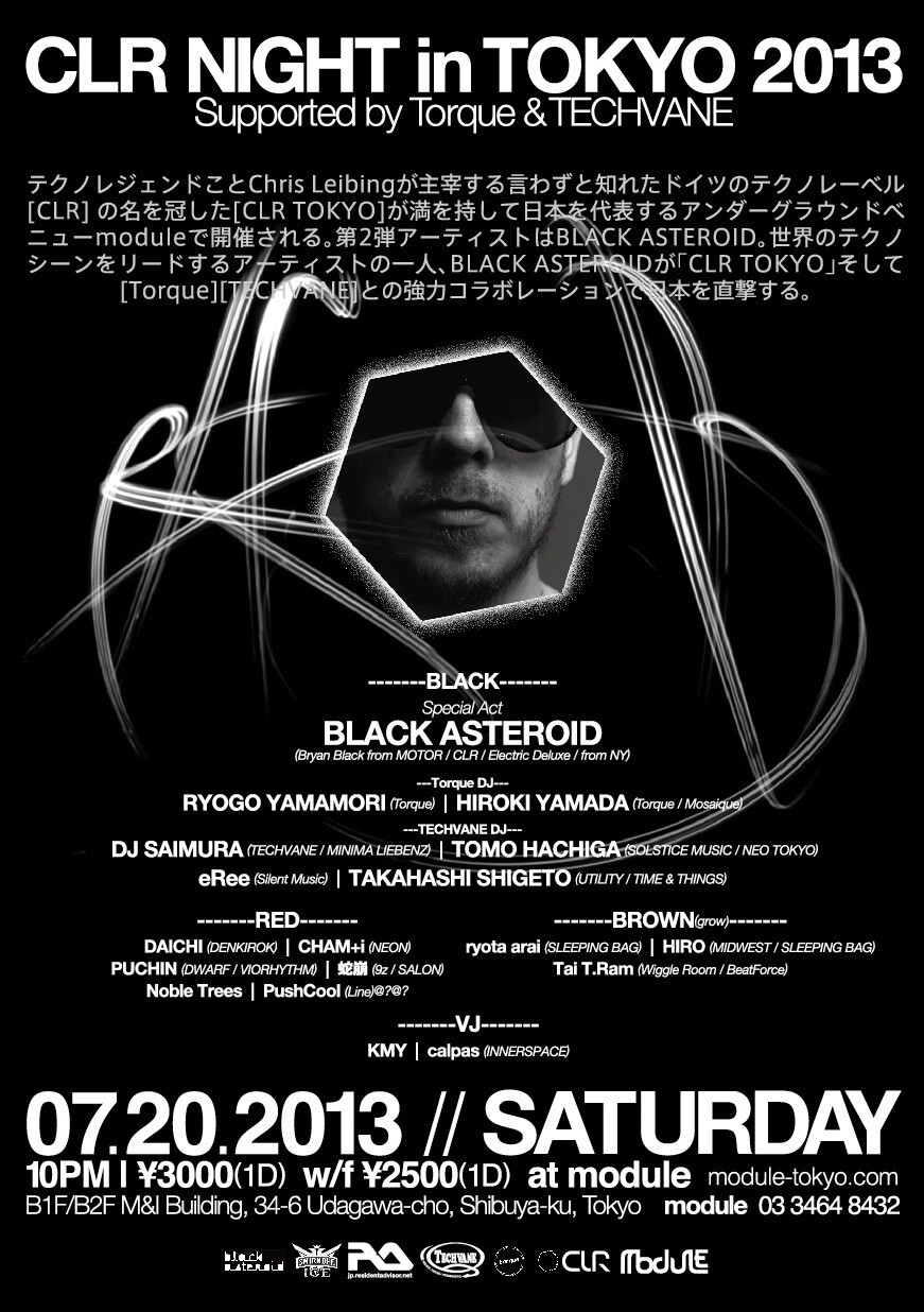 第2弾アーティストはBLACK ASTEROID。世界のテクノシーンをリードするアーティストの一人、BLACK ASTEROIDが「CLR TOKYO」そして[Torque][TECHVANE]との強力コラボレーションで日本を直撃する。