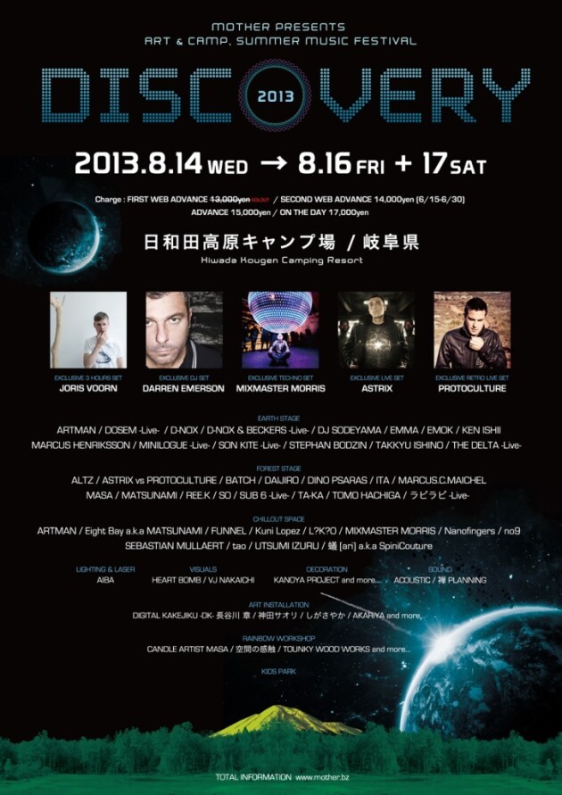 MUSIC+CAMP+ART+WORKSHOP+YOGA+MARKET+ECO+etc…2泊3日+後夜祭の全3泊4日に渡って開催される「DISCOVERY '13」は、標高1400mの爽やかな風が吹く、白樺の木立に囲まれた森のキャンプ場「日和田高原」にて開催されます。