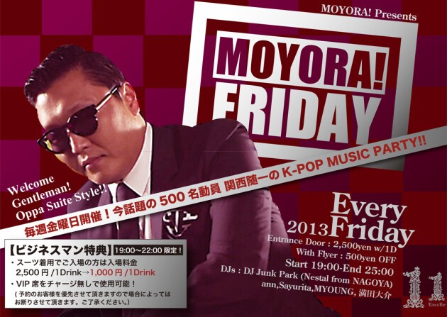 心斎橋のビル最上階に位置するエンターテイメントスペース[オンジェム]にて毎週金曜日に開催されている今、話題の500名動員する関西随一のK-POP MUSIC PARTY「MOYORA! FRIDAY(モヨフラ)」