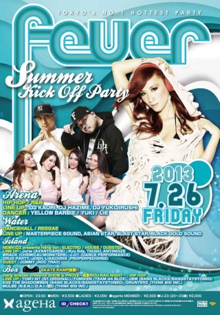 2013年の夏が、いよいよキックオフ!ARENAでは、DJ KAORI、DJ HAZIMEがHIP HOP、R&B、TOP40でフロアをロック。WATERは夏本番に向けて、サウンド勢がDANCE HALL / REGGAEでヴァイブス全開に。BOXはプロ・スノーボーダー、クリス・ ベレスフォードが立ちあげたサングラス・ブランド"DANG SHADES"(ダン・シェイディーズ)がミラー・グラスをイチオシに、夏を感じさせるパーティを開催。