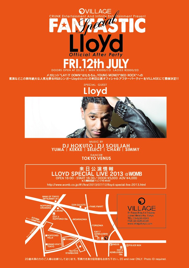 メガヒット"LAY IT DOWN"はもちろん、YOUNG MONEY"BED ROCK"への客演などこの数年絶大な人気を誇るR&BシンガーLLOYD(ロイド)の来日公演オフィシャルアフターパーティーをVILLAGEにて開催決定!