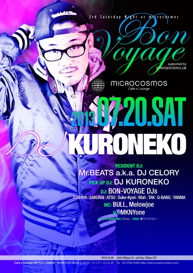 毎度お馴染み!!ミクロコスモス毎月第三土曜日のお約束、ボンボヤことBON-VOYAGE!!DJ CELORYを軸に他のパーティーと一線を画す抽斗豊富な選曲、一見さんも楽しめる雰囲気でフロアは常に笑顔で溢れています。多くのアーティストからの支 持も厚く、渋谷のHOP HOP文化を表す1つの代表的なPARTYといえるのではないでしょうか?今回のPICK UP DJは都内を中心に関東近郊でGUEST DJとしてPLAYする機会が多くなってきたボンボヤファミリーで急成長中の若手注目株DJ KURONEKOです。当日は気心しれた仲間や、思いを寄せる大事な人、はたまた気楽におひとりで…皆さんのスタイルに合わせてご参加ください・・・。皆 さまのご来場をボンボヤクルー・ミクロコスモススタッフ一同、皆様のご来場心よりお待ちしております。