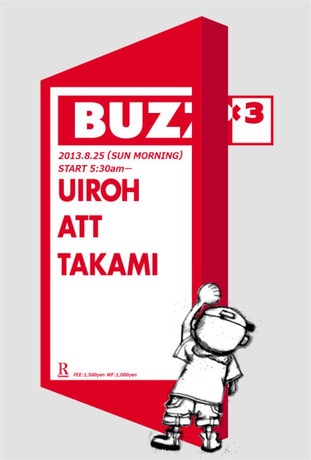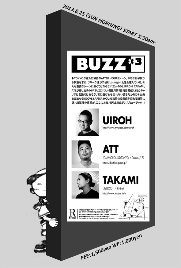 そんな重要なシーンに無くてはならない三人のDJ、UIROH, TAKAMI, ATTが繰り出すのが「BUZZ×3」(偶数月第一日曜日開催)。