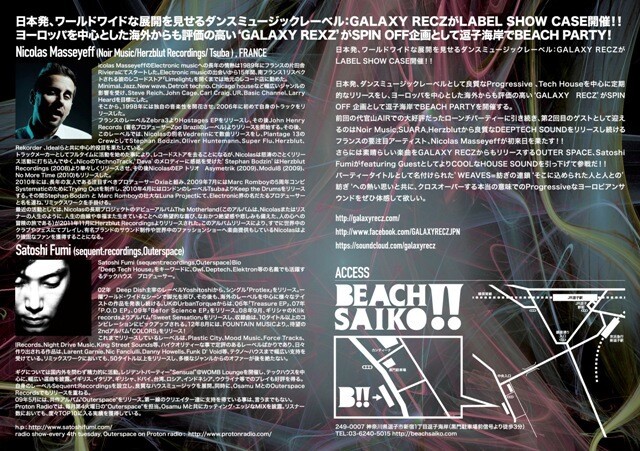 日本発、ダンスミュージックレーベルとして良質なProgressive 、Tech Houseを中心に定期的なリリースをし、ヨーロッパを中心とした海外からも評価の高い‘GALAXY RECZ’がSPIN OFF 企画として逗子海岸でBEACH PARTYを開催する。