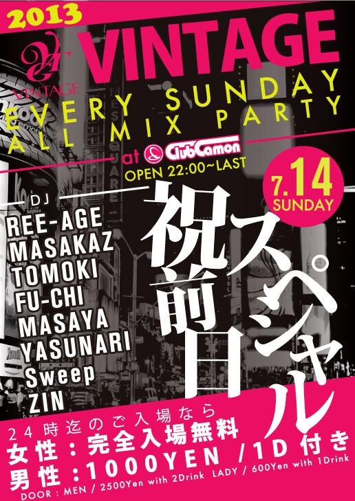 【毎週日曜オールジャンル】7/14☆祝前日SP★★話題沸騰!!日曜カモンは毎週大盛況のオールミックスパーティー『VINTAGE』☆☆24時まで女性完全入場無料★★24時以降もSNS割で超お得♪