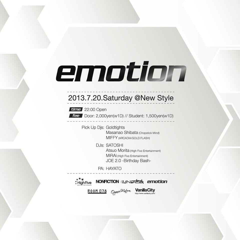 神戸で3年以上のロングパーティであるemotionが今回からリニューアル!現在進行形のTech House/Progressive Houseを神戸・大阪のTOP DJ陣が個性豊かにPLAY!サウンドとビジュアルが完璧にリンクした空間は必見です。今回、Pick Up DJとして、Goldtights、Masanao Shibata、MIFFYが登場します!