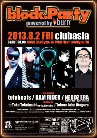block partyの夏が来る。デビューアルバムが各方面で話題をさらったtofubeatsが遂にblock partyにゲスト出演決定。さらに新たなフェーズに突入した"AUDIO GALAXY" RAM RIDER、block.fm人気プログラム"Future Beat Maniax"からNERDZ ERAが登場し、2013年の熱い夏をさらに熱くする!!