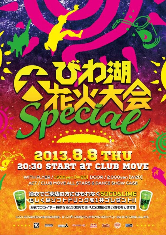 ※2013びわ湖大花火大会は荒天の場合、8/12(月)に延期になりますがMOVEのイベントは8/8(木)に開催いたします。