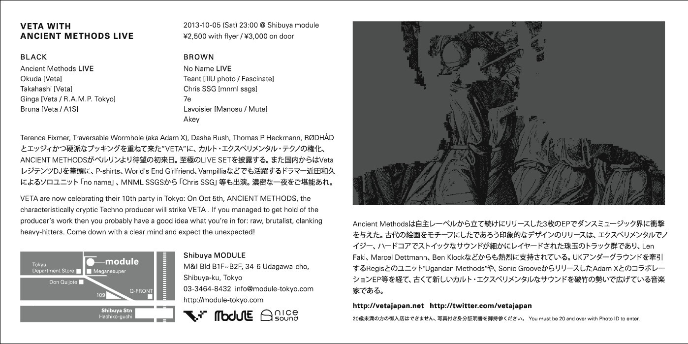 VETA are now celebrating their 10th party in Tokyo: On Oct 5th, ANCIENT METHODS, the characteristically cryptic Techno producer will strike VETA . If you managed to get hold of the producer’s work then you probably have a good idea what you’re in for: raw, brutalist, clanking heavy-hitters. Come down with a clear mind and expect the unexpected!