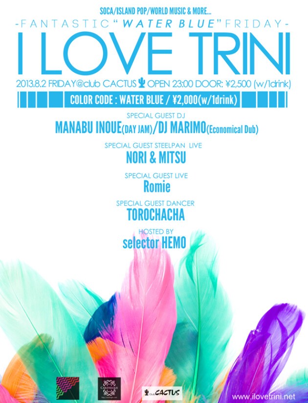 selector HEMOがホストを務める隔月のソカパーティー “I LOVE TRINI” 今回は8月2日(金)という夏まっただ中の開催ですので少しでも涼しげに!ということでFANTASTIC “WATER BLUE” FRIDAY!カラーコードは水色!水色を着用の方は通常の入場料2500円1ドリンクのところを2000円1ドリンクでご入場いただけます。毎度熱い夜になるんですが、今回も楽しい夜になることでしょう〜!いつものSOCA,ISLAND POPに加えて、今回は様々なWORLD MUSICも楽しめます!夏はすぐ終わってしまいます!是非一緒に楽しみましょう!!
