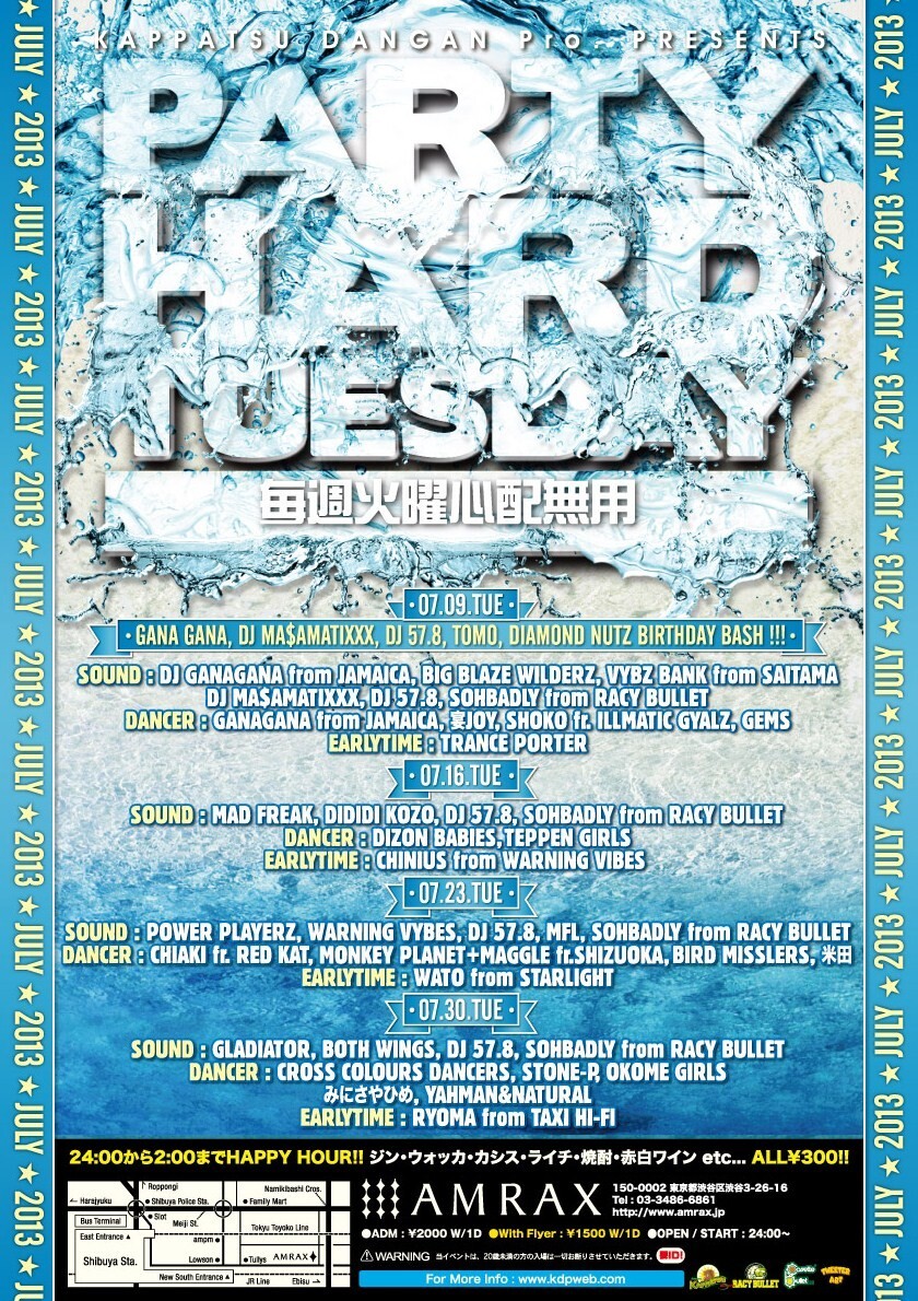 もともとは、AMRAXの前身の箱である、当時のCLUB SIMOONにて行われていた、『SIMOON LIGHT DANCE』を2006年4月いっぱい開き、2006年5月からCLUB UNITYにて行われ、タイトルも『PARTY HARD TUESDAY』とリニューアルし、ますますBIGなPARTYに!そして、2007年10月からはCLUB AMRAXに場所を改め、HOSTであるRACY BULLET & ENT DEAL LEAGUEと共に、毎週毎週、豪華なGUEST SOUND, ARTIST, DANCERを迎えて、引き続き行われている。毎週火曜は心配無用のBIG PARTY !