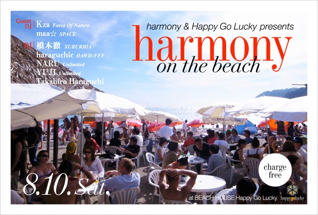渋谷カフェ・アプレミディにて2009年秋にスタートした「harmony」ですが、昨年に引き続き、今年も、逗子海岸Happy Go Luckyにて、出張版を開催できる運びとなりました。ゲストDJは、ヨーロッパ・ツアーから帰国直後のKza(Force Of Nature)。そして、バレアリックDJとして評価の高いmaa☆。波の音に耳を傾けながら、すてきな音楽を楽しみましょう。終了後は、POP UP CENTROでアフター・パーティーもあります。こちらも、チャージ・フリー。すてきな夏の思い出に。