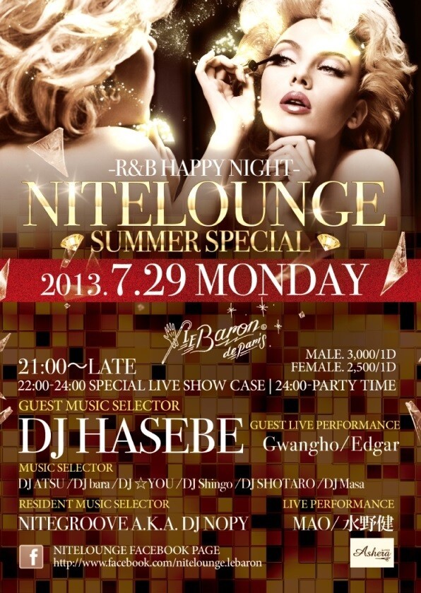 毎回超豪華なゲストを招き異例の盛り上がりをみせるNitelounge。『大人の遊び場と極上のR&B』をコンセプトに、選び抜かれ洗礼された本物のプレイヤー達が、非日常的の空間でアナタの為に最高の一夜をお贈りします。前半22:00~24:00にかけては、実力派シンガーのGWANGHOと最も目を離せない新人シンガーEDGERがスペシャルライブパフォーマンスを披露!他にもレギュラーアーティストの水野健やReechoを中心に都内で活躍するシンガーが脇を固めます。また後半のパーティータイムでは日本を代表するDJ/リミキサー/プロデューサーのDJ HASEBEを筆頭に、NitegrooveやDJ ATSU、DJ BARA、DJ☆YOUなどが参戦。TOP40からお決まりのパーティーチューンまで、ツウな選曲で独自のR&B路線を爆発させます!