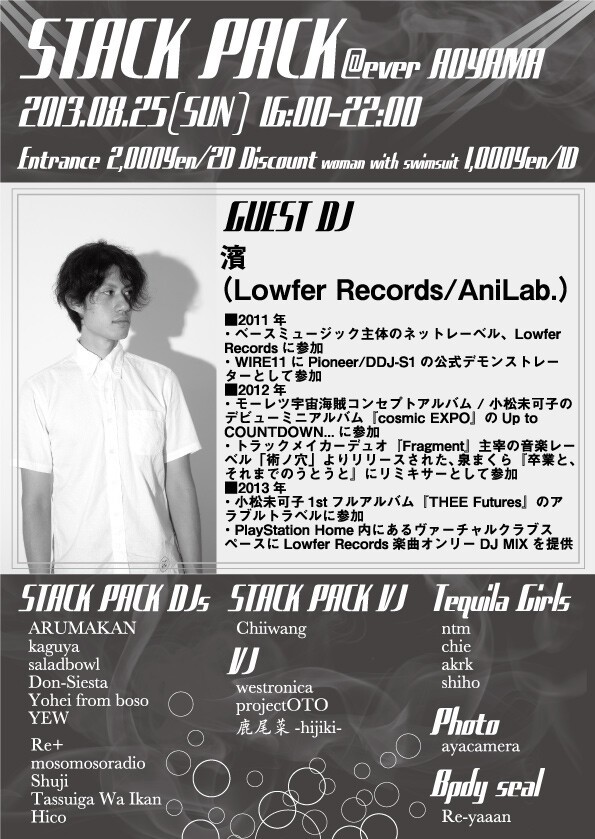 STACK PACKリニューアル第一弾のゲストDJは、スクラッチを駆使し様々なパーティーでその個性を存分に発揮しているDJ 濱(Lowfer Records/Anilab.)!!!!!!!!!!
