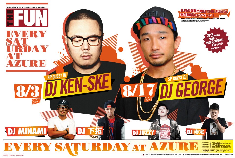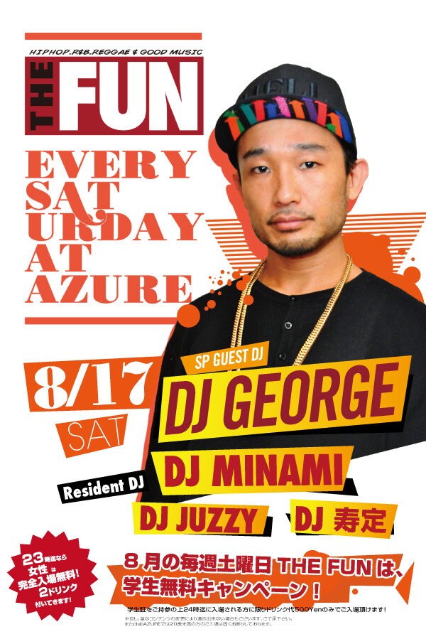 知らない人は無し、大阪いち有名なこの場所この曜日この時間。SOUL FOOD、SATURDAY AZUREに続く、毎週土曜日の新定番パーティー『THE FUN』が、2011年10月より始動!DJ MINAMI & DJ 下拓の、揺るぎないツートップは勿論、アーリータイムから、HipHopを中心にR&BやReggae、また近年のチャートを賑わすダンスチューンなど幅広い選曲が楽しめます!関西クラブ遊びの登竜門とも言える『土曜日のアズール』には、本当に色んな人が遊びに来ており、毎週来ても新たな音楽・お酒・友達と出会える、チェック必至のパーティーです!出会いの秘訣は、何より“楽しむ”こと!週末土曜日の夜を素敵なものにしたいパーリーピーポー達よ!JUST HAVE FUN!!