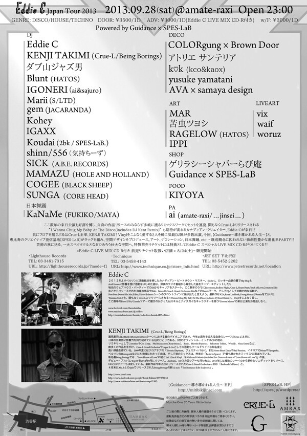 ここ数年の来日公演も好評を博し、自身の作品リリースのみならず多岐に渡るリミックスワークでヒットを連発、間もなくCrue-Lよりリリースされる ”I Wanna Chug My Baby At The Disco(includes DJ Kent Remix)” も期待が高まるカナディアン・クリエイター、Eddie Cが来日共にフロアを揺さぶるはCrue-L主宰、KENJI TAKIMI Vinylをこよなく愛する2人を軸に気鋭DJ陣が多数出演。今回、【Guidance導き導かれる人生】と、恵比寿のクリエイティブ発信基地【SPES-LaB】がタッグを組み、空間デザインをプロデュース。アート、デコレーション、日本舞踊、etc… 既成概念に囚われない独創性豊かな進化系PARTY