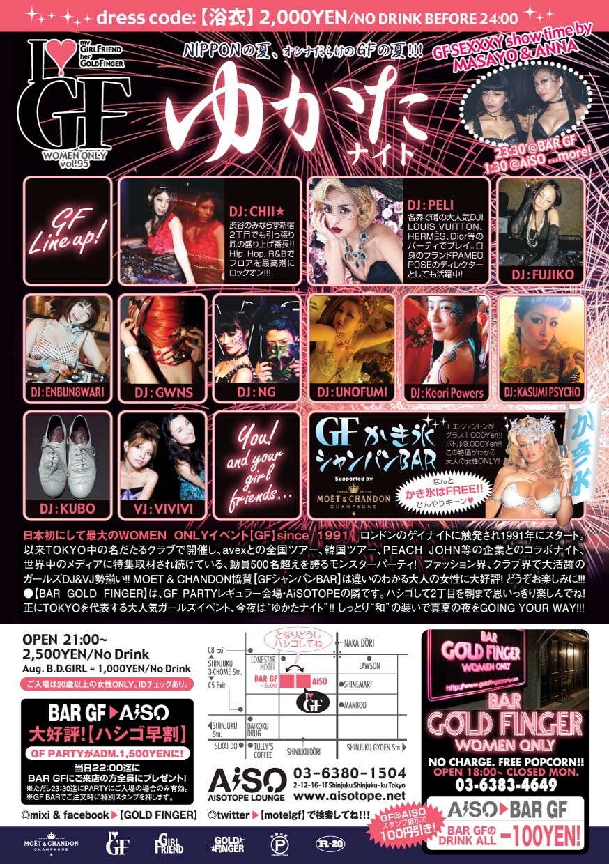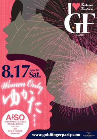 ●【BAR GOLD FINGER】は、GF PARTYレギュラー会場・AiSOTOPEの隣です。ハシゴして2丁目を朝まで思いっきり楽しんでね! 正にTOKYOを代表する大人気ガールズイベント、今夜は“ゆかたナイト”!! しっとり“和”の装いで真夏の夜をGOING YOUR WAY!!!