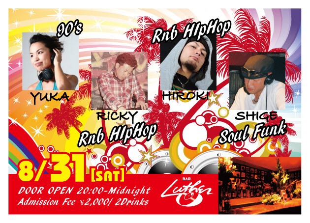 各DJが年代、ジャンル別にコアなナンバーまでPlayします。 DJ YUKA Ricky Hiroki SHIGE