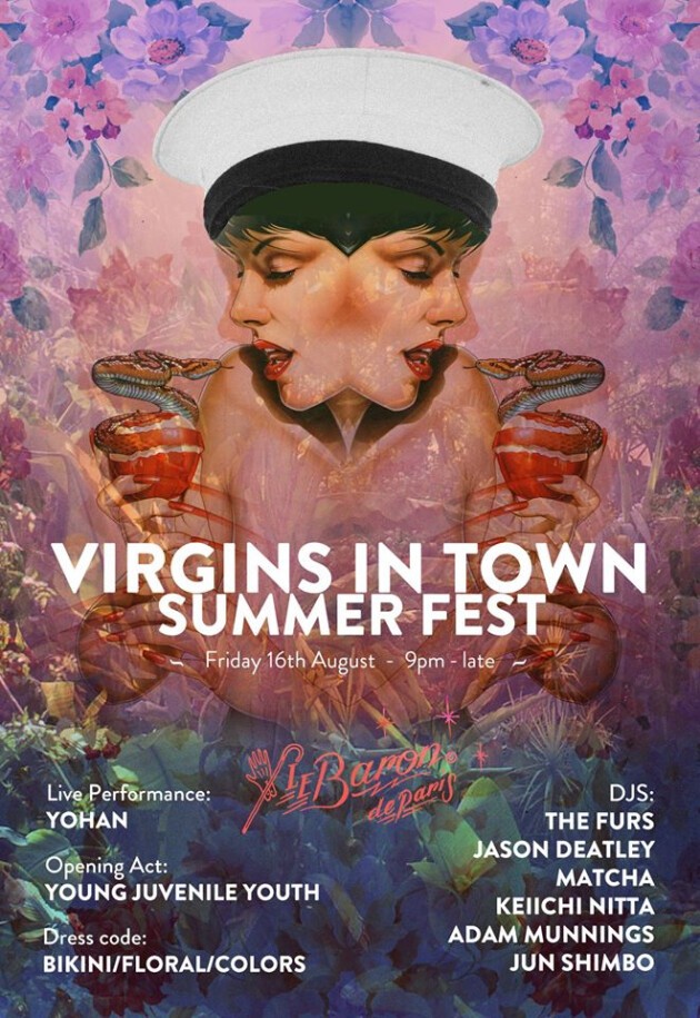 東京のナイトシーンに生息するパーティーモンスターズの溜まり場“VIRGINS IN TOWN”が今年の夏もLe Baron de Parisにやってきます。DJ、アーティスト、ダンサー、モデルなど、様々な分野で活躍するVIRGINSとその取り巻きたちの起こす危ない化学反応。さてさて、今回のパーティーテーマはビーチパーティーです。アロハシャツやサマードレスはもちろんのこと、ビキニでのご来場もお待ちしております。夜空に輝く星もなければ眩いサンセットもないけれど、ナイトネオンに輝くライジングスターたちの秀逸なDJセットはここにあるから!!