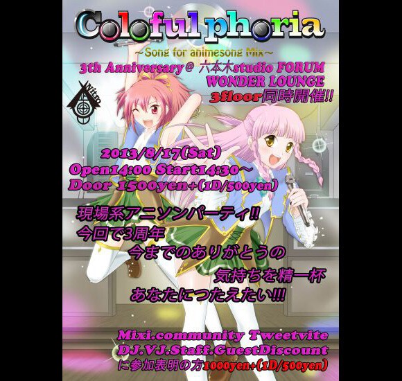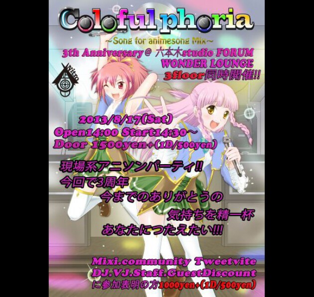 今回のカラフォリは3周年を記念しまして、FORUMアニソンイベント初の3フロア開催 3周年記念という事で参加表明で入場料も1000YEN※別途1D-500YENかかります。と大変お得使用になっています ここ3年いろいろなイベントや個人の方に助けられて、ここまでやってこられました。 (´Д)