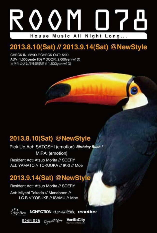神戸は素晴らしいクラブミュージックカルチャーが育まれた都市であり、そのクオリティーの高さは言う間でもありません。ROOM 078 はそんな神戸のアーティストの中から、レジデンツの DJ Atsuo Morita、SOERY を中心にテクニックを兼ね備えた中にも個性的なDJを集め、世界最先端のサウンドが神戸スタイルのフィルターを通して体感出来ます。毎回思考をこらしたネーミングのフードブースも楽しめます!ROOM 078・・・チェックインは22:00、チェックアウトは5:00を予定しております。ルームサービスは最高のHOUSEサウンドをご用意致しております。是非お立ち寄り下さいませ。