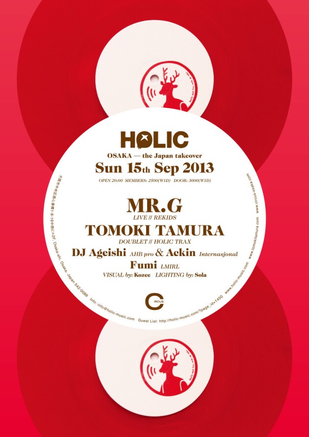 またサポートのDJには、大阪の至宝DJ Ageishi & Ackin、彼等の楽曲はPrince Thomasが主宰するInternasjonalからリリースされ、secretsundazeのmix CDにもコンパイルされるなど、世界から注目されている。さらに勢いに乗る新世代DJ Fumi、 以前にもHOLICをサポートしてくれた、VJ Kozee、そしてライティングにはSolaの参戦も決定しているので、大いに注目だ。