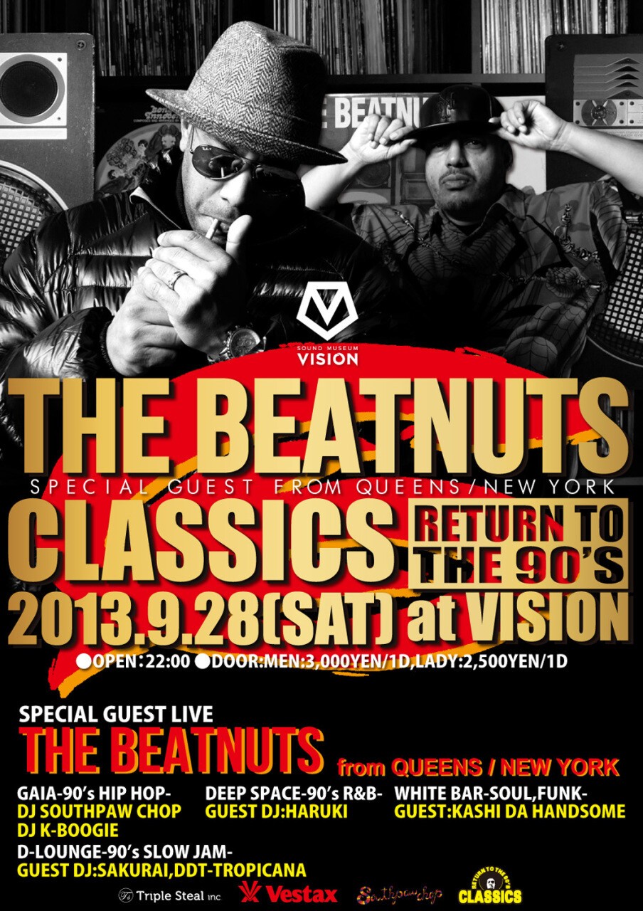 ヒップホップの黄金期といわれる90年代にフォーカスし、各フロアのコンセプチャルな演出でオーディエンスを珠玉のミュージックジャーニーへと導いていくパーティ。“CLASSICS”に、まさにそのテーマにふさわしい90年代を代表するスーパースターが登場する。BEATNUTSは、現在もフロアでプレイされ続ける代表作「Watch out now」「Turn I t Out」を筆頭に、独創的なサンプリングセンスでヒット曲を量産。現在のエレクトロとの融合を予感させる曲もあり、ずば抜けた革新性が当時のシーンに大きなセンセーションを与えたアーティストである。進化したレジェンドの貴重な勇姿を、見逃してはならない。