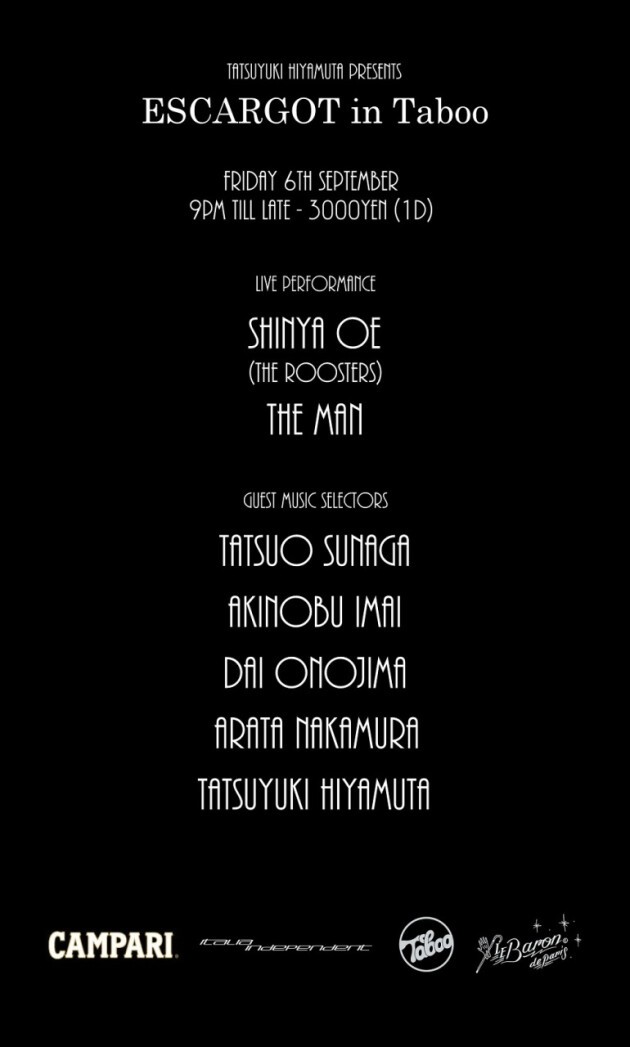 優れたアーティストやパフォーマーを冷牟田竜之がジャンルレスにキャスティングし、コアな音楽ファンを魅了し続けるイベントTABOO。その要素を最大限に活かし大人なラウンジ系イベントへと昇華した新たなイベント“エスカルゴ”が、今夜Le Baron de Parisに初上陸します!