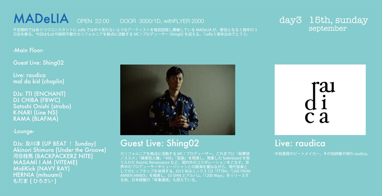 不定期的ではありつつコンスタントにsolfaでは中々見れないようなアーティストを毎回招致し開催しているMADeLIAが、節目となる5周年の3日目を飾る。今回はもはや説明不要のカリフォルニアを拠点に活動するMC / プロデューサーShing02に加え、クリエイター集団OILWORKSの音プロデューサー / リミキサー /DJ、OLIVE OILを迎える。「solfa 5周年おめでとう!!」
