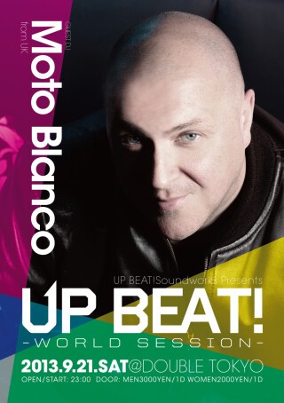 常にシーンを牽引し、ロングランをして進化し続けているUP BEAT!がここDOUBLEでも新たなチャレンジをする!!! 同タイトル『UP BEAT!』は11周年目に入り、現在も代官山AIRで開催されておりそのままの勢いで今回はWorld sessionと題しワールドスタンダードな音楽をメインに展開されていく。 第一回目は数々のremixをこなし鬼才の名をほしいままにしているUKの巨匠『moto branco』を招致し開催される、 彼のリミックスワークは全世界で受け入れられ、グラミー賞にもノミネートされるほどである。 キャッチーなそのremixにフロアーは完全にロックされるであろう…